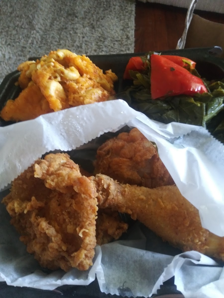 Fried Chicken with Collard Greens and Macaroni and Cheese